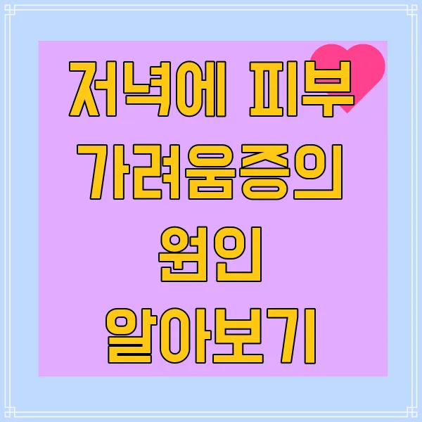 하루의 마무리를 지으며 편안한 시간을 보내다 보면, 가끔 피부에 가려움증이 찾아오는 경우가 있습니다. 저녁이면 더욱 심해지는 이 증상, 혹시 여러분도 경험해 보셨나요? 밤에 피부가 가려워지면 정말 짜증나는데, 그 이유가 무엇인지 궁금해지지 않나요? 가려움증의 일반적인 원인부터 피부 상태와 저녁의 관계까지, 함께 살펴보면서 원인을 알아보도록 해요. 그리고 나서, 이 불편함을 완화할 방법도 찾아보면 좋겠네요. 편안한 저녁을 위해 작은 팁이 될 수 있을 거랍니다.